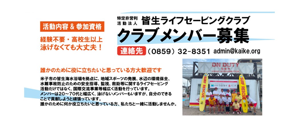 皆生ライフセービングクラブは、日本トライアスロン競技発祥の地・鳥取県米子市皆生に1999年1月に設立されました。
