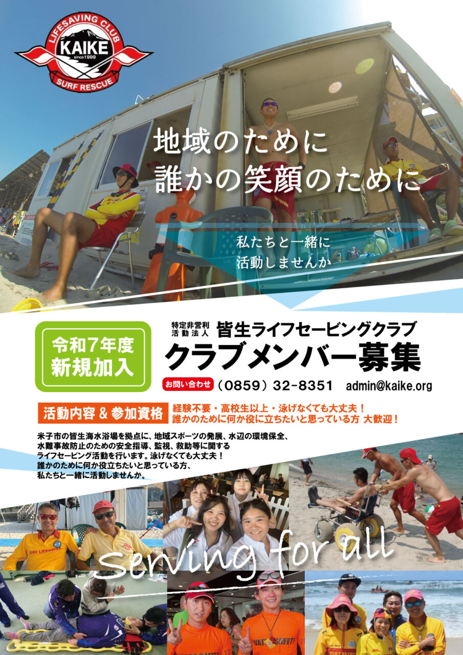 皆生ライフセービングクラブは、海や水辺の安全を守り、地域に安心を届けることを目的に活動しているボランティア団体です。私たちは、ライフセービング活動を通じて「人命を守る」「仲間と支え合う」「地域に貢献する」ことを大切にしています。